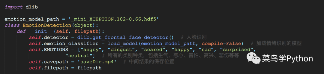 以上是对于流程图的介绍,那么我们接下来来看一下,程序是如何实现的吧。首先是第一步,如何对人脸进行框定,并判断其表情的类别。