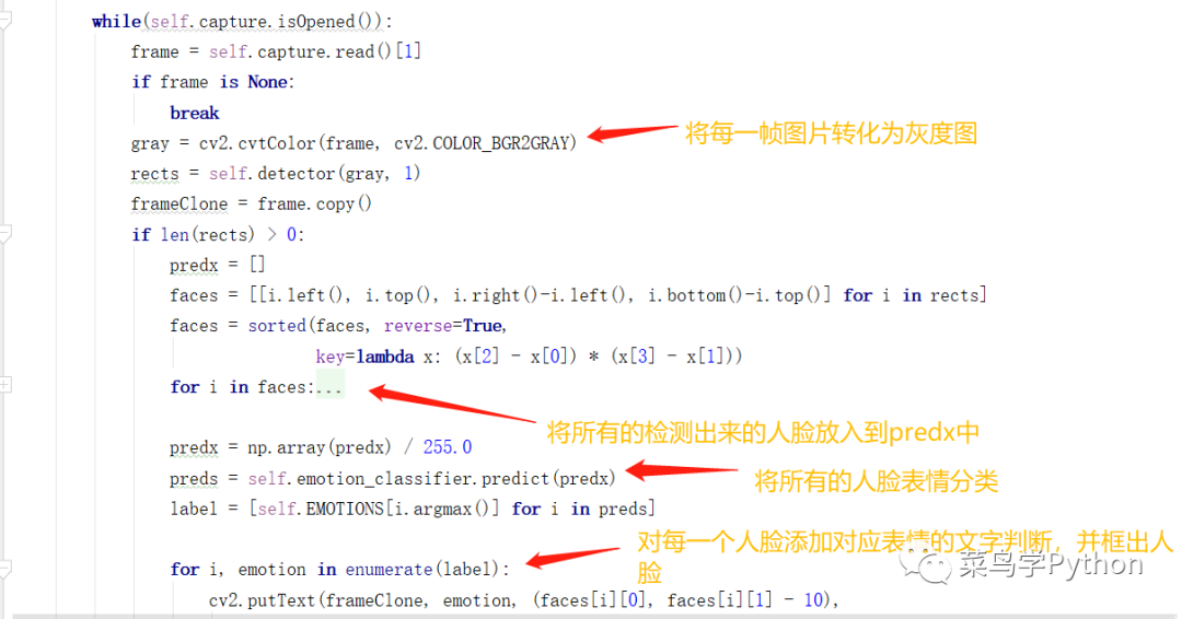 上图程序中,程序首先将每一帧图像转化为灰度图,然后将检测出来的所有人脸进行分类,并在图像上添加对应的人脸表情陈述,框出人脸。我们将处理好的每一帧程序写入到具体的存储文件中。