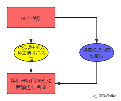 上图中,我们直接将小姐姐们的表情用文字来表达出来,例如高兴(happy)和惊(surprised)。我们要做的就是将视频中演员的表情搭配上对于表情的解读进行展现,然后配上音频,合成我们的视频,流程图如下所示。