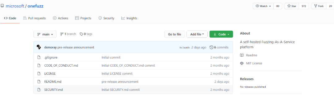 Project OneFuzz现在可以在GitHub上使用。而且,OneFuzz在Github上标星 572,累计分支 20 个,感兴趣的小伙伴们别错过了(项目地址:https://github.com/microsoft/onefuzz)