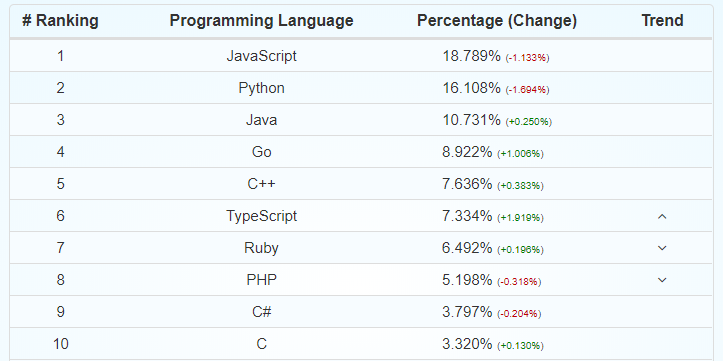 但观察每种编程语言的排名,我们可以看到 Go 的受欢迎程度正在显著提升,而 JavaScript 和 Python 的受欢迎程度正在下降。