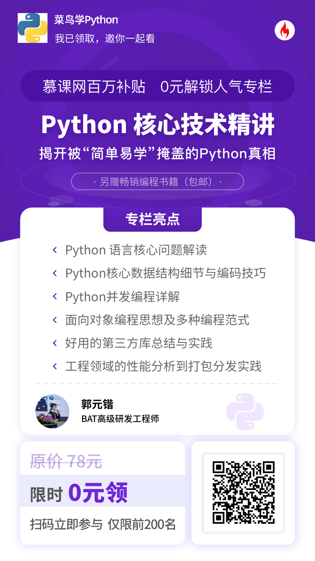 见我听得一脸懵逼,老杨顺手甩过来一门专栏:慕课网原价78元的Python热销专栏,现在0元直接领!