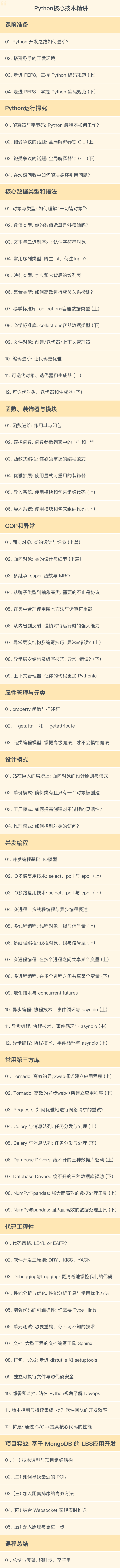 从Python开发环境与常用工具、编码规范为出发点,一直讲到 Tornado、NumPy 等常用第三方库,最后还会带大家做一个基于 MongoDB 的 LBS 应用开发的Python项目。
