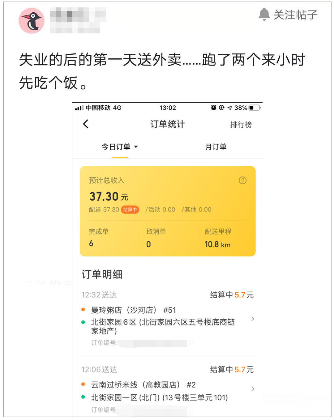 近日,看到某职场论坛上的一则帖子,一位七八年测试经验的程序员发帖写到:“失业一个月后转行送外卖……跑了两个来小时先吃个饭”,并且晒出了当天的收入。网友们看完以为看错了。