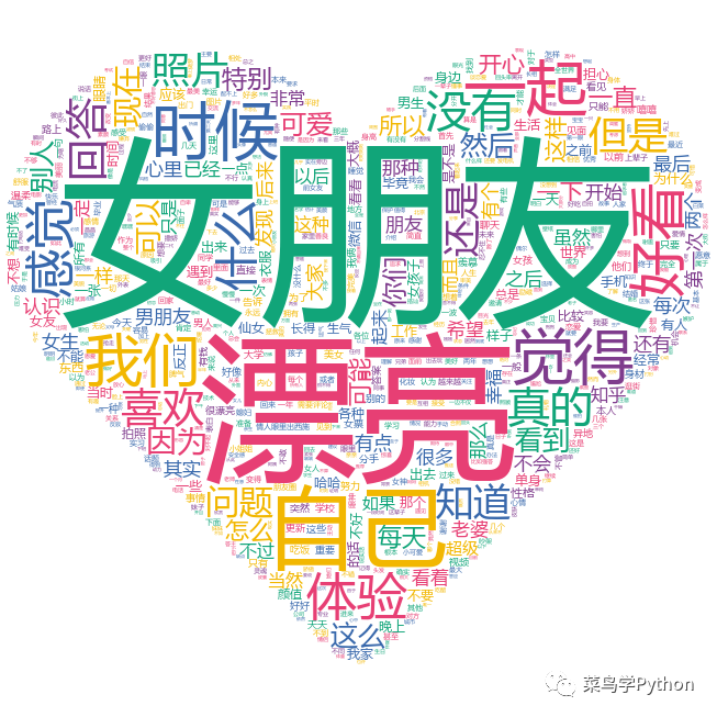 可以看到大家的词云中,关键词包含女朋友、漂亮、好看、喜欢、我们等内容,小编真的是越看越酸。