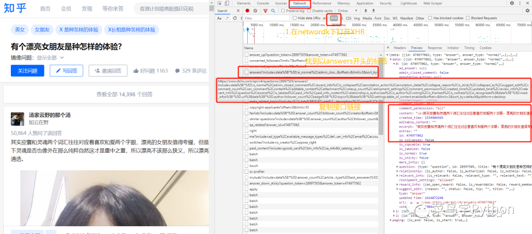 对于数据的获取,我们需要构建特定的知乎数据接口,就能够获取得到回答者的回答内容。对于数据接口的获取,如下图所示: