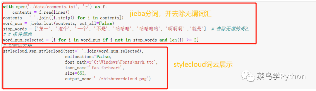程序中,首先利用jieba库将大家的回答进行分词处理,然后利用stylecould库进行词云的可视化展示。