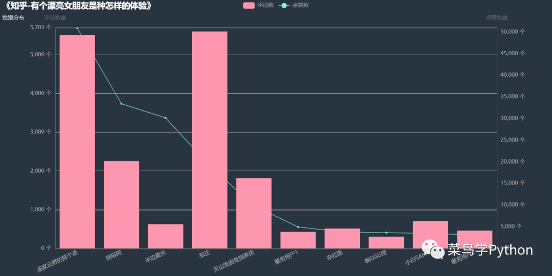 上图中,柱状图代表的是评论数量的分布,其纵坐标参考左侧的坐标轴,而线型图则是代表着点赞数量的分布,其纵坐标参考右侧的坐标轴。从图中可以看出,汤家云野的那个汤和郑正两位回答者获得了最多的评论数量,但是同“汤家云野的那个汤”获得高点赞数不同,”郑正“获得了较少的点赞的数量。
