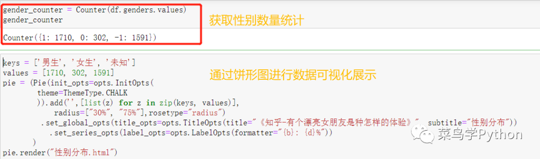 程序首先通过内置库collections中的Counter类来统计回答者的性别,然后通过饼形图来进行可视化展示。