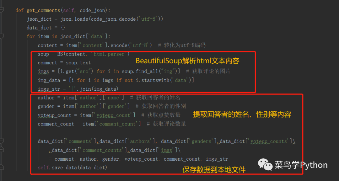 在self.get_comments函数中,通过BeautifulSoup库来解析json数据中的html文件,从而获取回答者的回答内容,并抓取回答者上传的图片内容。同时在json数据中,可以直接解析获得回答者的姓名、性别等内容信息。