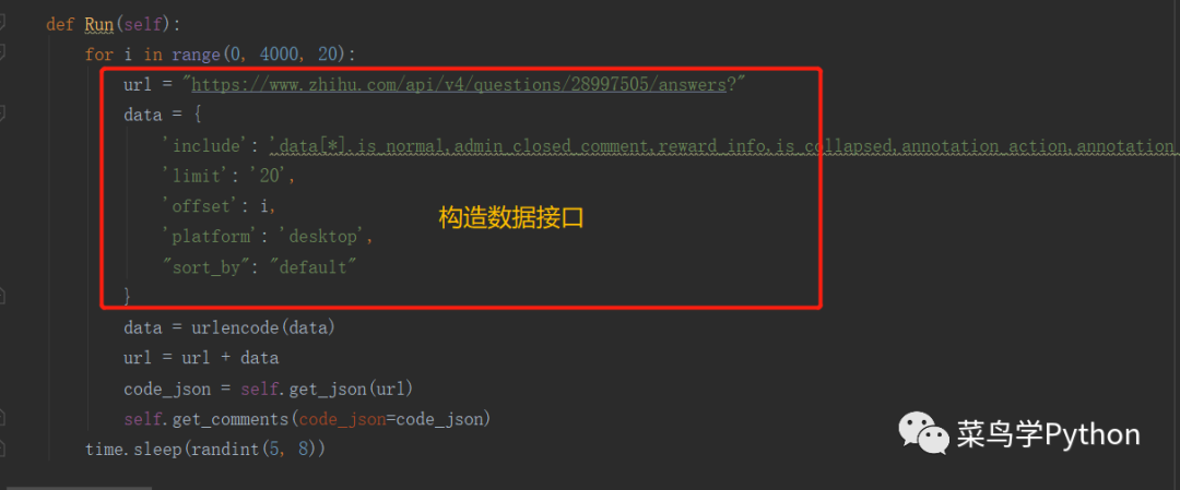 程序中,通过for循环来不断的构造数据的接口,接口中包含了include、limit、offset等关键词,大家想要抓取其他回答的数据时,只需要更改不同问题的数字索引部分,例如下下述链接中的数字部分:
