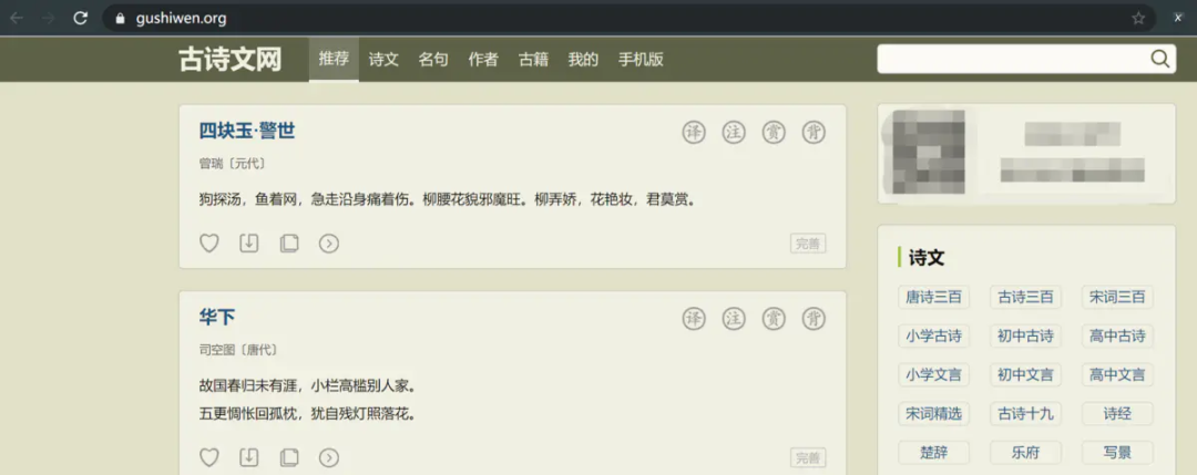 要利用爬虫完成这项工作需要先选择一个合适的网站,这里我们选择了 古诗文网https://www.gushiwen.cn/