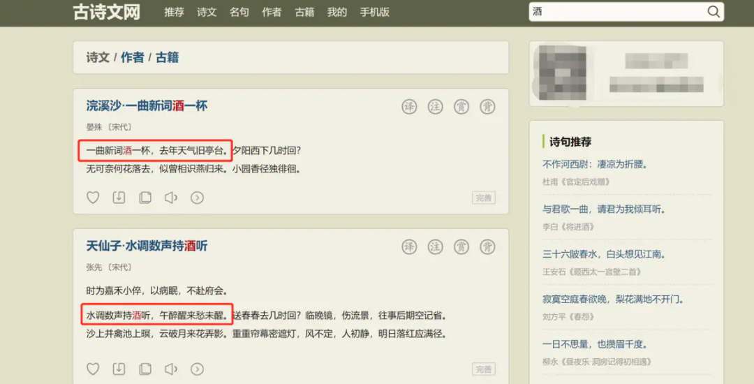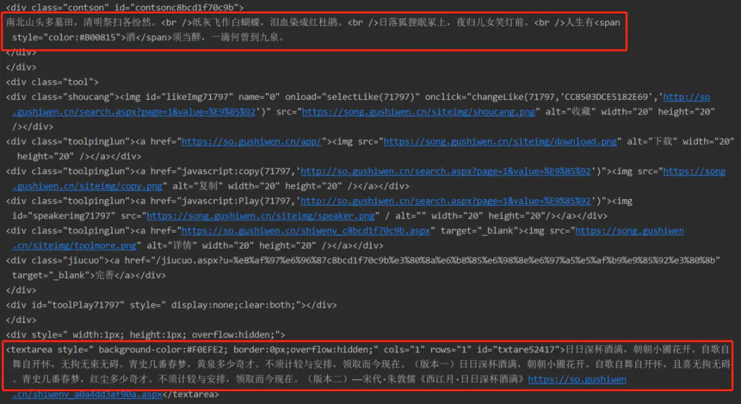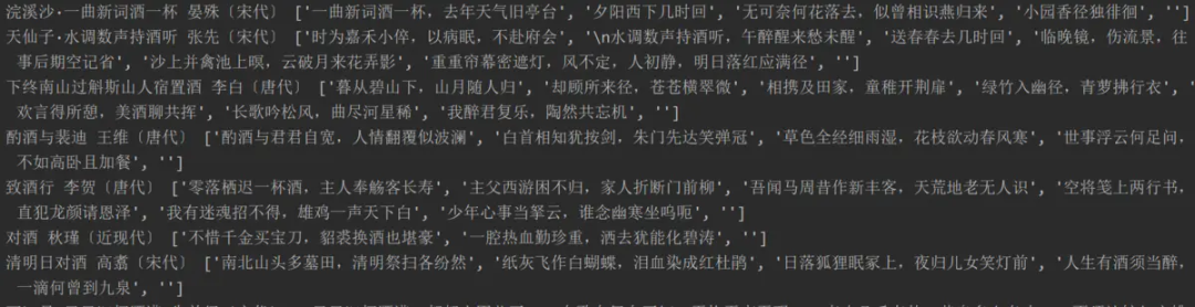 我们注意到,返回的结果是一整首诗或词,关键字所在的句子仅为其中一句。后面我们爬取信息时也需要做到过滤。