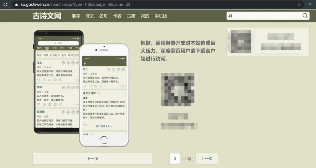 也就是说要完整获取全部诗文需要下载 App,本文简化问题只爬取前 2 页的内容,后续有机会再分享 App 相关爬虫推文。在翻页的过程中我们注意一下 URL 的改变: