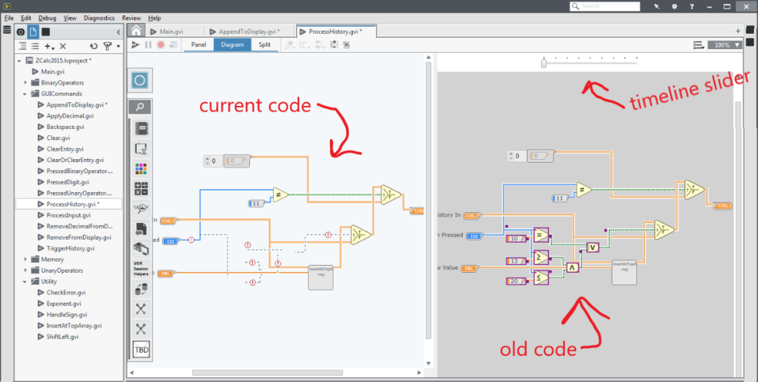 Austin Henley 表示他早在 2015 年就开始草拟了一些设计方案,旨在为开发人员提供所需的信息,且所需的工作量较少。在他的设计中,开发人员可以一同查看代码的新版本和原版本,同时自动记录重要更改。由于 Henley 可以访问 LabVIEW 编辑器的源代码,因此他为 LabVIEW 的实验版创建了一个带有已启用功能的分支。