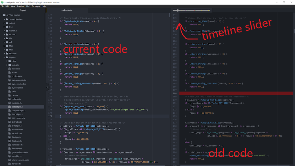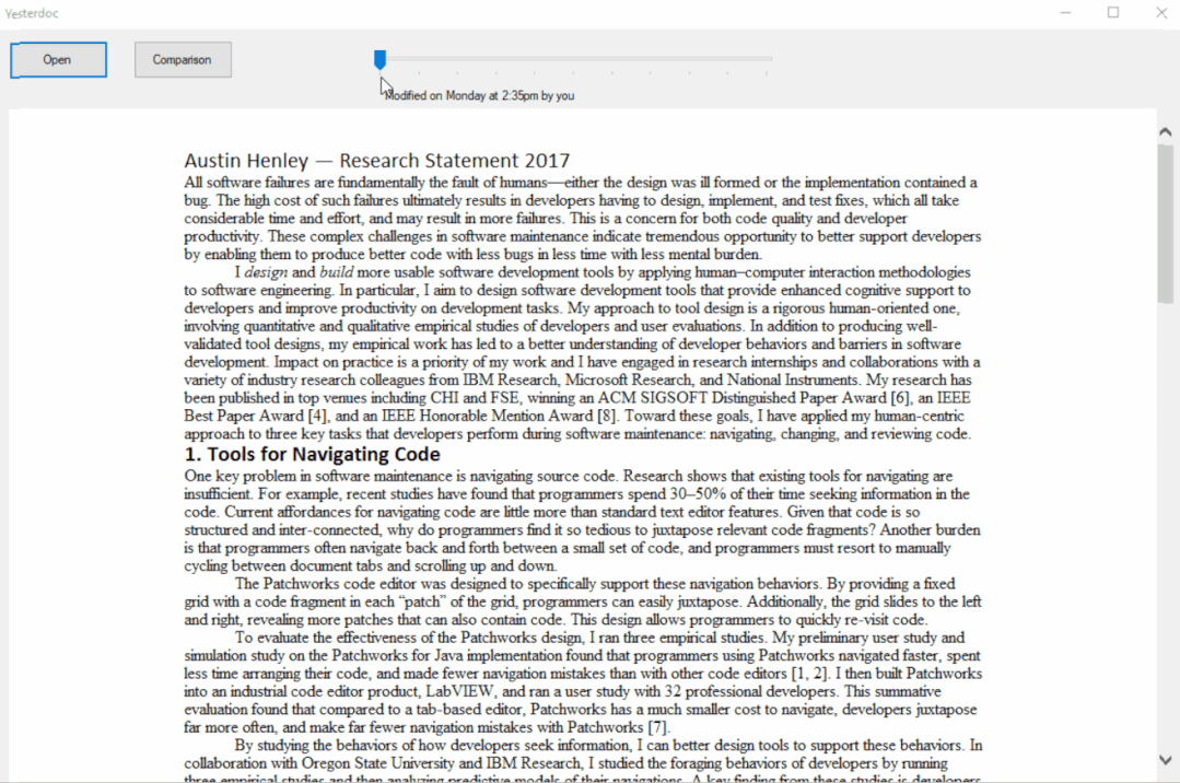 之后,Austin Henley 开发了一个名叫 Yestercode 的工具。它可以让你在时间轴上浏览代码历史纪录就像看 YouTube 视频一样。进行回溯编辑时,它可以汇总新的修改,并在时间轴上为这个版本建立分支。在这以后,你可以使用时间轴转到先前的版本,并与当前版本的代码并排查看。以前的版本是只读的,但仍允许人们从中复制粘贴。最后,这个工具还显示注释,以便于人们知晓在更高版本上(比如 diff)进行过哪些更改。