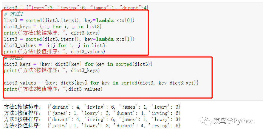 方法2:则是直接利用了对于键或者值进行排序,再利用排序后的键或者是值来构造最终的字典,且程序简洁。
