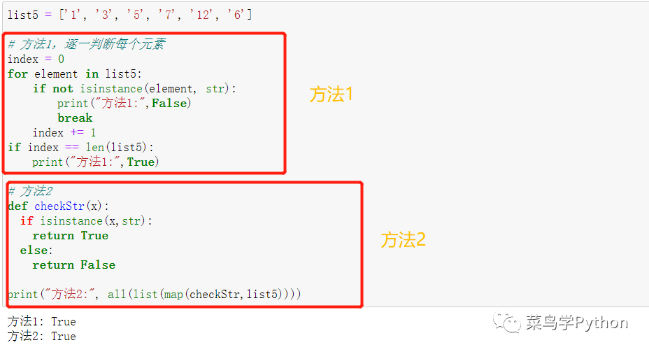 方法1:采用的方法是逐个的判断列表中的每一个元素,如果有任一个元素不是字符串,则输出False。当全部循环结束后,如果index数值等于列表总长度,则输出True。