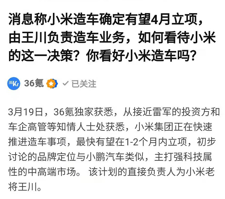 其实看来小米对造车这件事很犹豫,据说王川之前给雷军多次建议造车,基于综合因素的考虑,被否了。