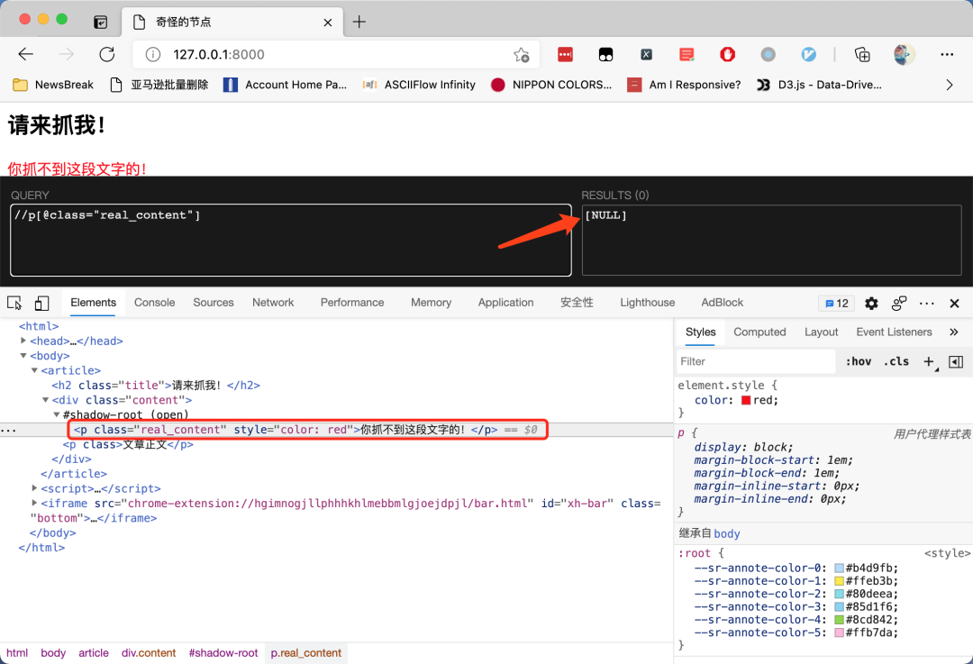 要特别注意的是,拿到shadow-root节点以后,只能通过 CSS 选择器进一步筛选里面的内容,不能用 XPath,否则会导致报错。