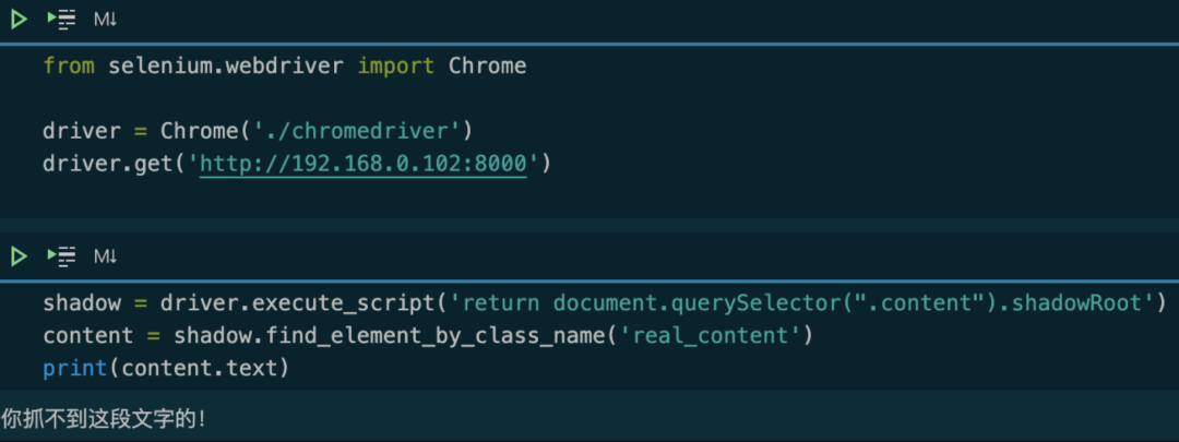 而这个被嵌入的影子标签,就像 iframe 一样,是无法直接使用 Selenium 提取的。如果强行提取,那么,我们需要使用 JavaScript 获取 shadow DOM,然后再进行提取。我们来看一段可以正常工作的代码: