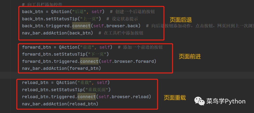 可以发现,三个程序块其实现方式大致都是相同的,因此我们以“页面后退”的控件来进行程序讲解。程序首先创建了一个QAction的按钮控件对象,并设置它的状态提示为“上一页”。