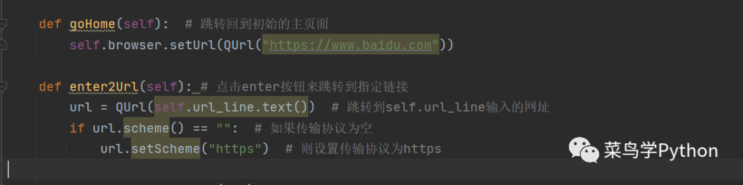 程序中通过添加文本输入控件QLineEdit来让用户输入网址,同时QLineEdit控件通过按下回车键,来绑定self.enter2Url函数来实现页面的跳转。self.enter2Url函数实现如下图所示。