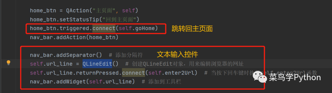 除此之外,导航栏中还需要添加文本输入的控件,可以让用户通过输入网址url来实现页面的跳转。程序如下图所示: