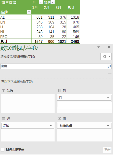 2)求出不同品牌下,每个地区、每个月份的销售数量之和