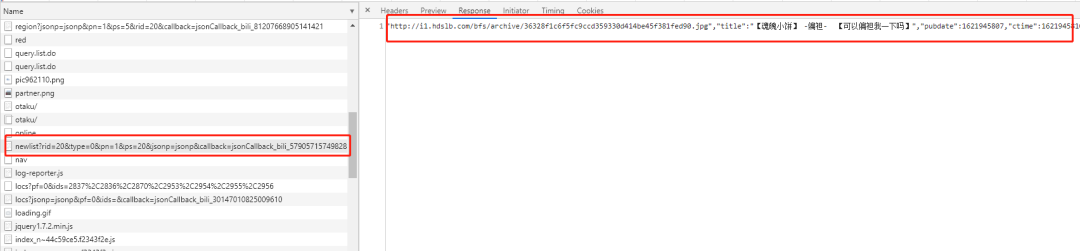 然后打开 F12 的控制面板,可以找到一条 https://api.bilibili.com/x/web-interface/newlist?rid=20&type=0&pn=1&ps=20&jsonp=jsonp&callback=jsonCallback_bili_57905715749828263 的 url,其中 rid 是 B 站的小分类,pn 是页数。