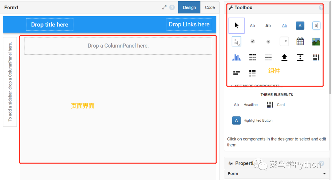 创建应用程序后,Anvil 会转到页面的设计界面中: