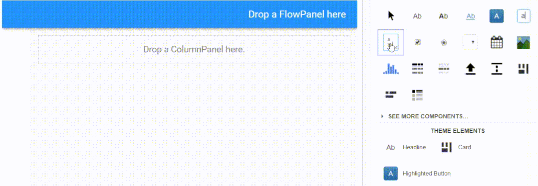 如上图所示。页面设计可以通过拖放组件的方式完成。我们通过拖放输入字段、按钮和输出标签这三个组件,实现一个简单的页面功能。对于组件的拖放,可以按照下图的方式进行操作。