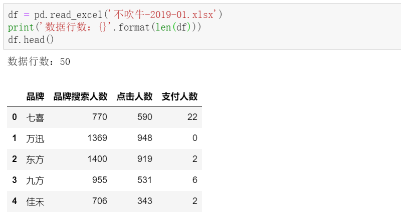 每张表都有50个品牌,包括了品牌名、品牌搜索人数、点击人数和对应的支付人数这几个关键字段。