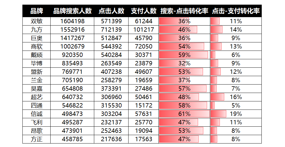 从仅有的head5数据可以看到,双敏品牌以160万的搜索人数独占鳌头,但是!排名第二的九方,虽然搜索人数少了40多万,却能凭借较高的搜索-点击转化率和点击-支付转化率,在支付人数上远超双敏,成为支付之王。