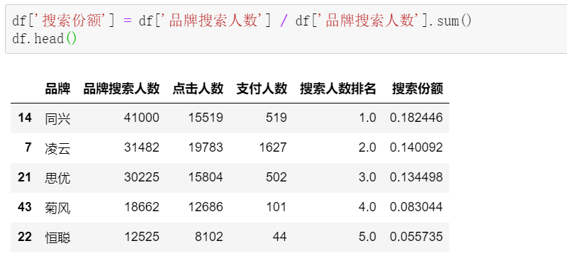 df['搜索份额'] = df['品牌搜索人数'] / df['品牌搜索人数'].sum()