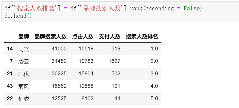 df['搜索人数排名'] = df['品牌搜索人数'].rank(ascending = False)