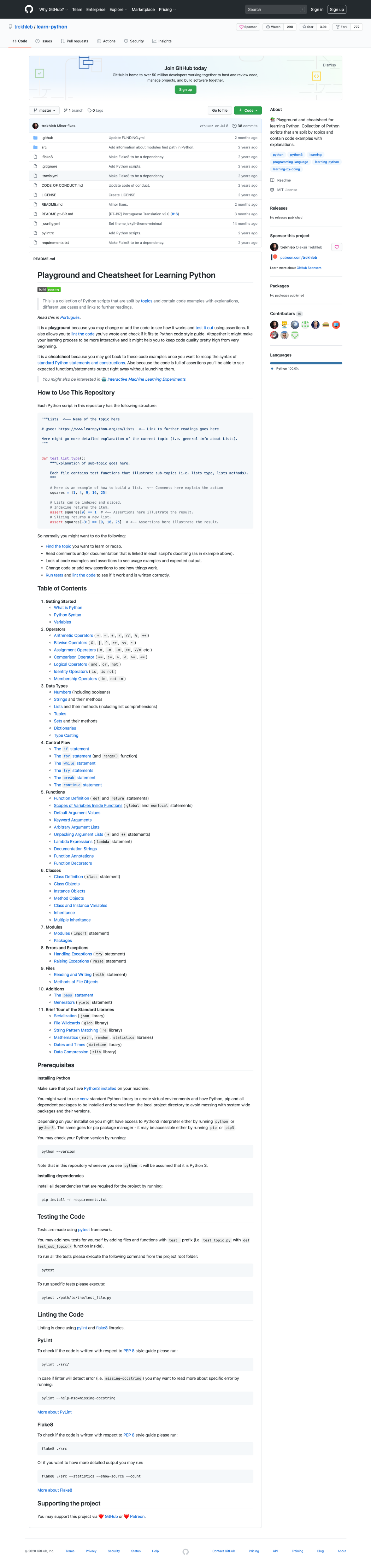 这个存储库还可以作为Python的介绍,帮助你从初级水平上升至中级,这里的中级指的是熟练地使用这种编程语言,而不仅仅是简单的循环和算法。该存储库是一个Python脚本集合,每个脚本都是一个核心类别的子主题,比如“操作符”、“数据类型”和“控制流”。