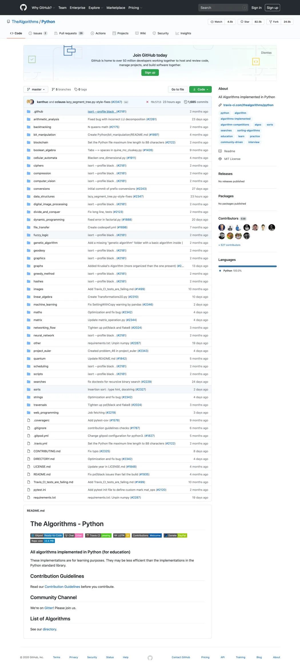 这个存储库还提供了一个文件集合,向你展示如何在Python中实现不同的算法。这些算法被分成从“算术分析”到“区块链”到“数据结构”等类别。如果你是Python的新手,我建议你先打好基础,因为这个存储库实际上是为那些已经熟悉该语言并希望加深其算法知识的人准备的。作者还为其他一些主要语言(Java、c++、C、Go、Javascript)创建了类似的“学习算法”存储库。