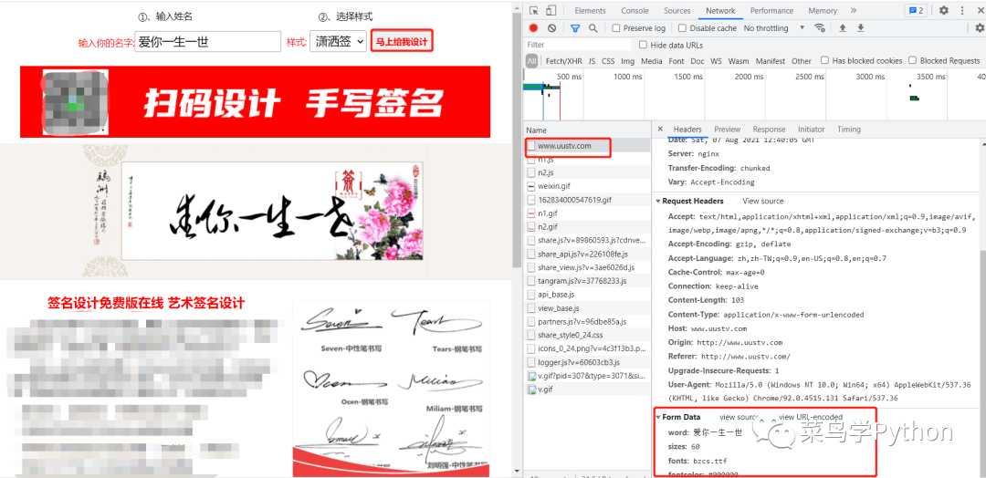 可以看到,当我们点击“马上给我设计”按钮后,会向网址http://www.uustv.com/来post数据内容,数据包含了四项内容,分别为: