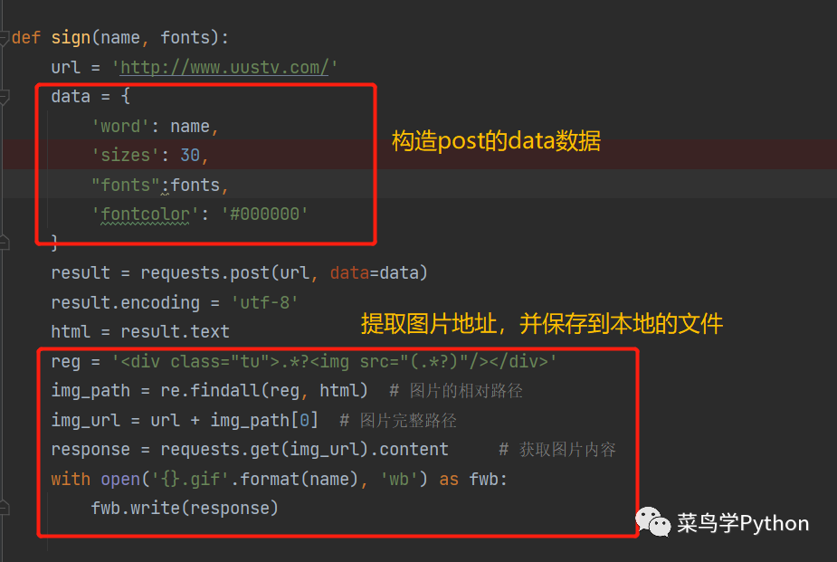 上面菜鸟哥带领大家对网页的内容进行了分析,并获取得到生成的图片链接地址。接下来,我们通过程序的编写,来实现上述的过程,程序如下图所示: