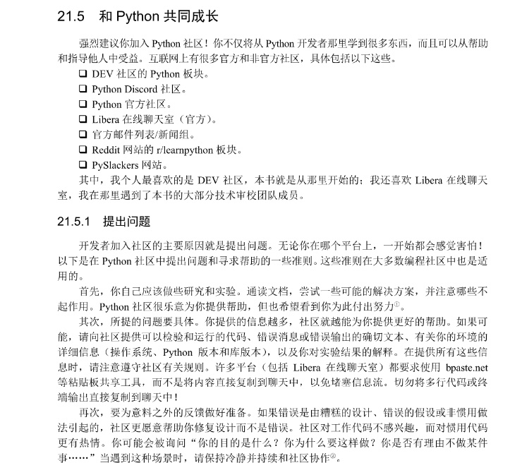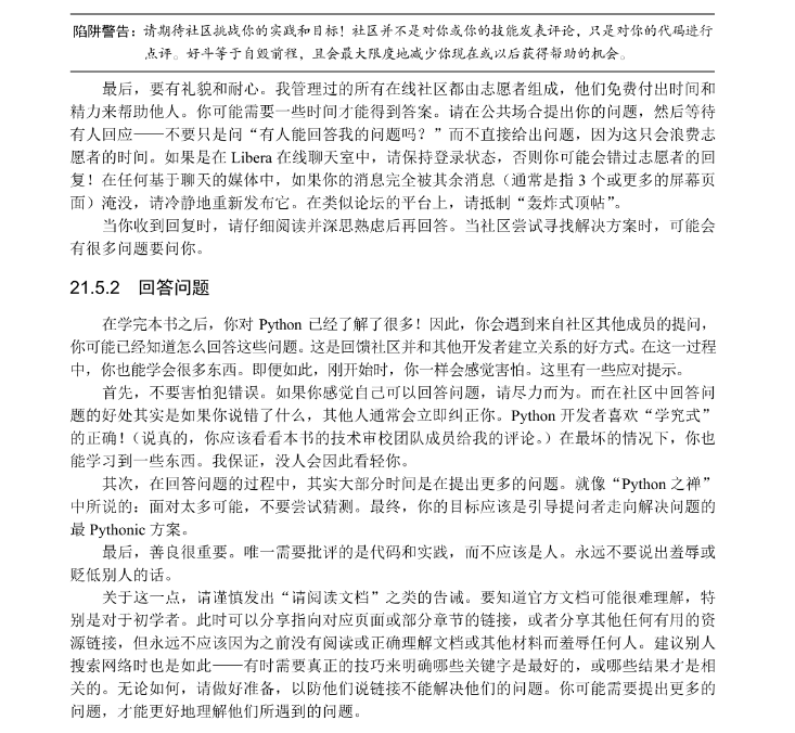 第五部分“超越代码”(第18-21章)讲解实际项目的打包、分发、调试、日志、测试和剖析等内容,并介绍各种值得探索的Python应用方向。