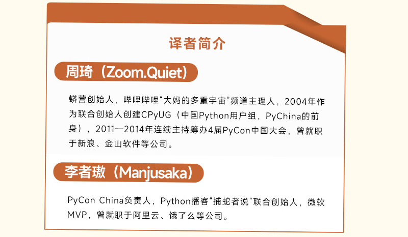 本书的翻译工作则请来了PyChina创始人和PyCon China负责人,以确保把本书的知识内容和趣味性生动、准确地呈现给读者。