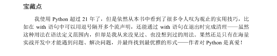 (3)发掘优雅技巧:即使是拥有21年Python经验的资深开发者也从中发现令人惊叹的实用技巧,例如在with语句中优雅管理多个资源流及其退出清理操作,展现了源于海量实战的、对Python优雅特性的深刻理解和应用。