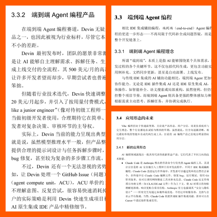 随着AI技术的不断进步,端到端Agent编程正逐步成为现实。这类编程方式通过构建智能体(Agent),实现从需求分析、代码生成、测试验证到部署上线的全自动流程。书中提到的“30分钟用Vibe编程做出可用产品”的愿景,正是端到端Agent编程潜力的生动体现。