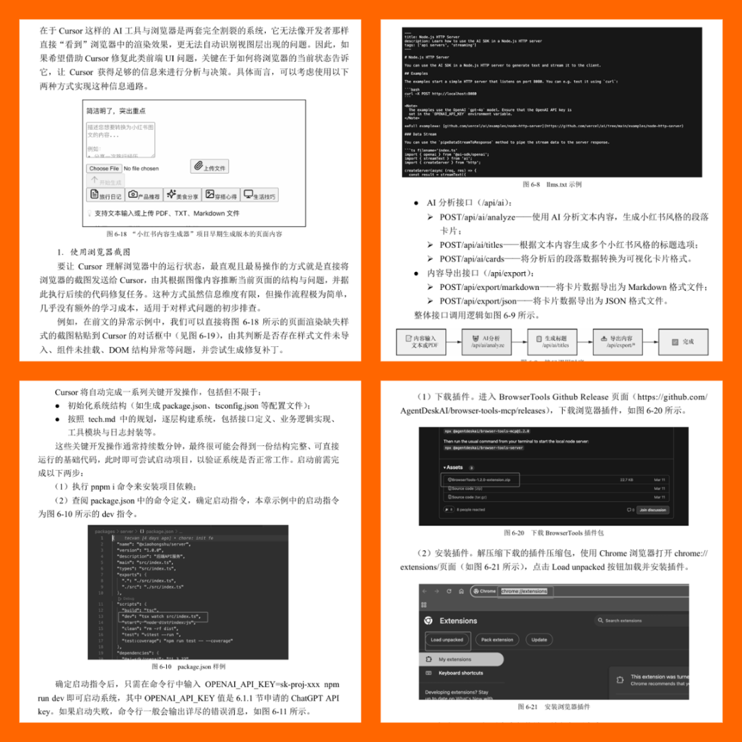 前端开发则关注用户交互和界面展示。书中利用Tailwind CSS和React等现代前端技术栈,结合AI生成的UI组件和交互逻辑,快速构建出了美观且易用的用户界面。同时,通过AI辅助进行页面调试和优化,确保了前端展示的流畅性和兼容性。