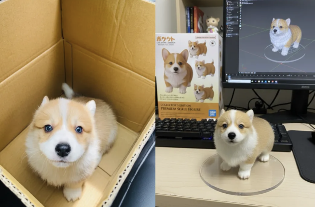 只需将想制作的主体(人物、宠物或物件)放入参考图,在提示词中指定每个元素的质感:“1/7比例PVC材质”、“光泽涂料”、“透明圆形底座”等,模型就能将任何实物转化为精美的手办模型。