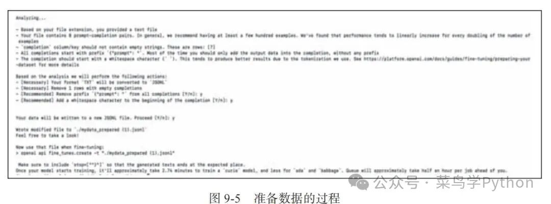 openai tools fine_tunes.prepare_data -f ./tmp/data.txt准备数据的过程,会对本地数据进行分析和处理,最终生成一个新的JSONL格式的文件,如下图所示。