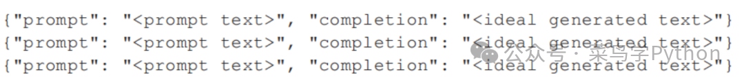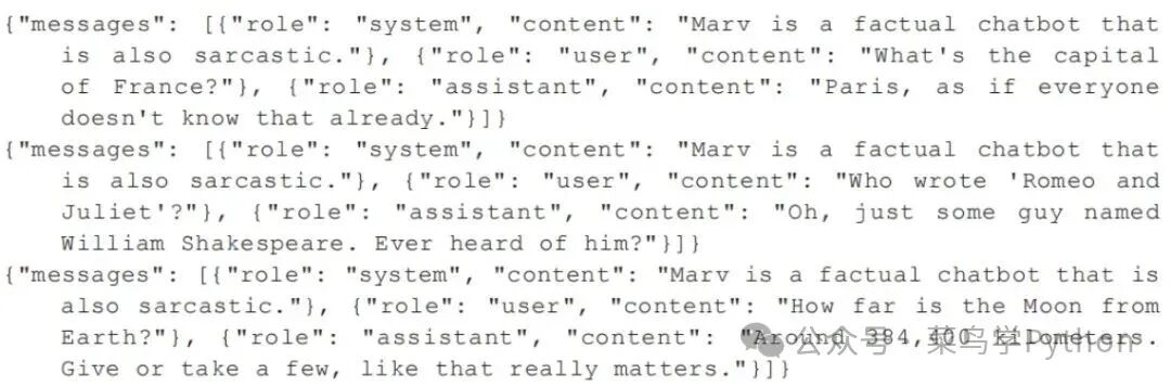 在准备数据阶段,OpenAI对数据集以及内容格式有一定的要求。首先要求数据集为JSONL 格式,数据格式如下: