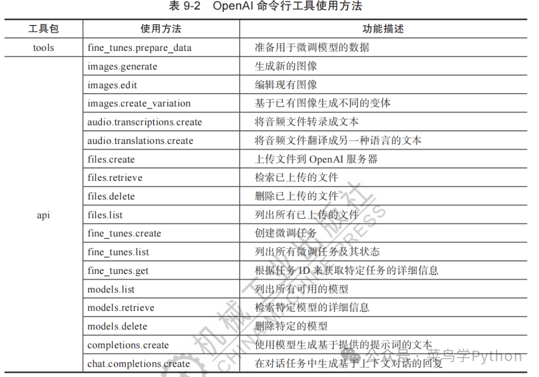openai api -h或openai api --help从帮助工具的查看结果可以发现,命令行工具支持图像、音频、文件和模型等,具体使用方法见表: