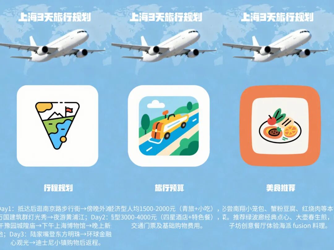 你只需要输出主题比如:上海3日游的旅行规划,就会呼呼的出了一堆小清新的旅游指南图文: